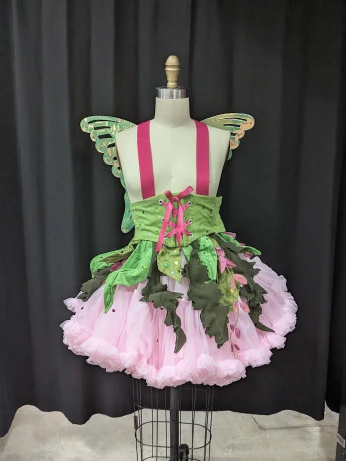 This is Farrah’s Fairy Costume. I made the tutu. I created the waist cincher from a preexisting vest. I made all of the leaves and bedazzled the whole thing.